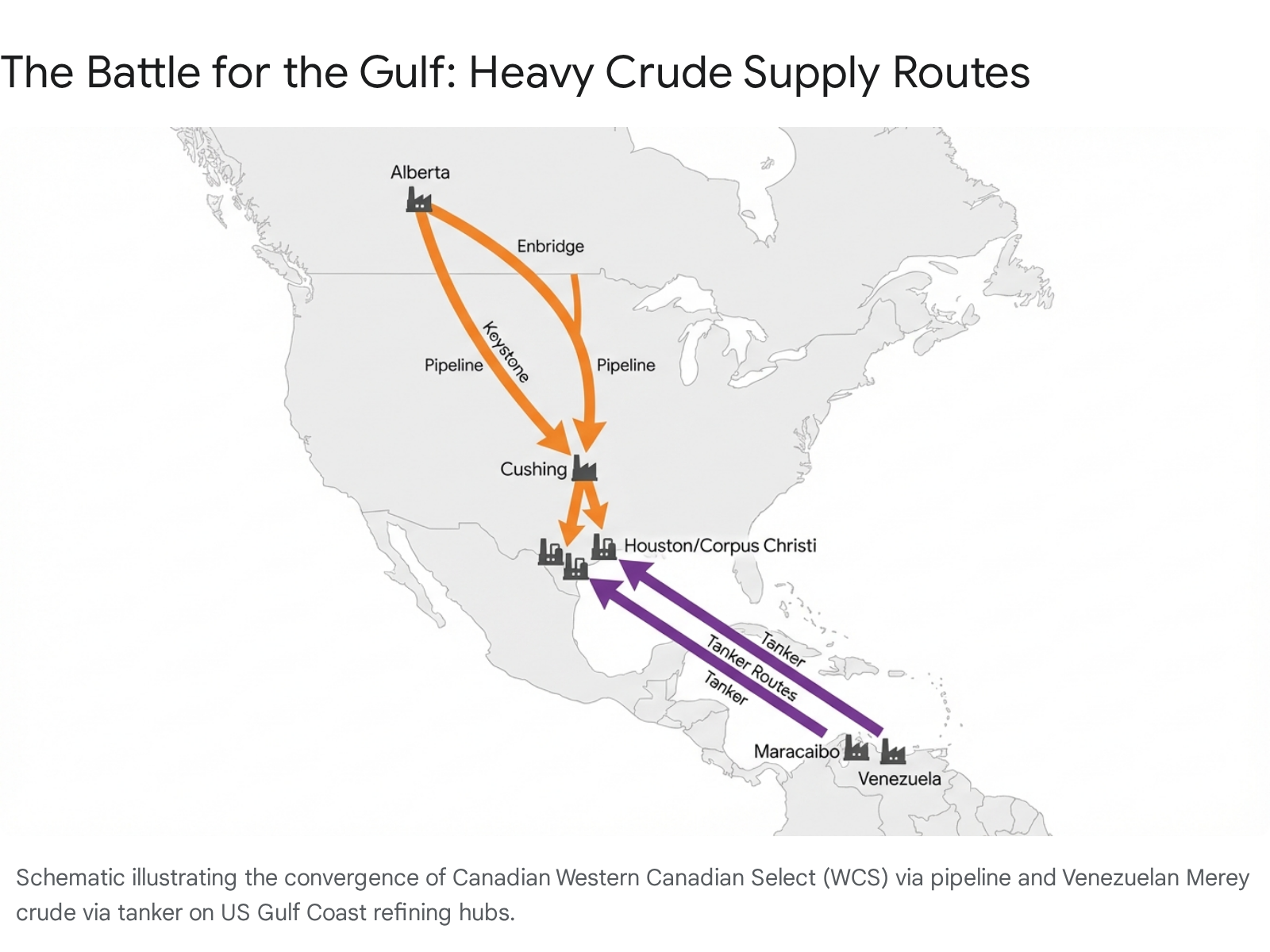 - Price Impact: As Venezuelan volumes ramp up (in the medium term), they will displace heavy crude currently imported from Canada via pipeline and rail. This increased supply competition at the Gulf Coast will likely widen the WCS-WTI differential, effectively lowering the price Canadian producers receive for their oil.36