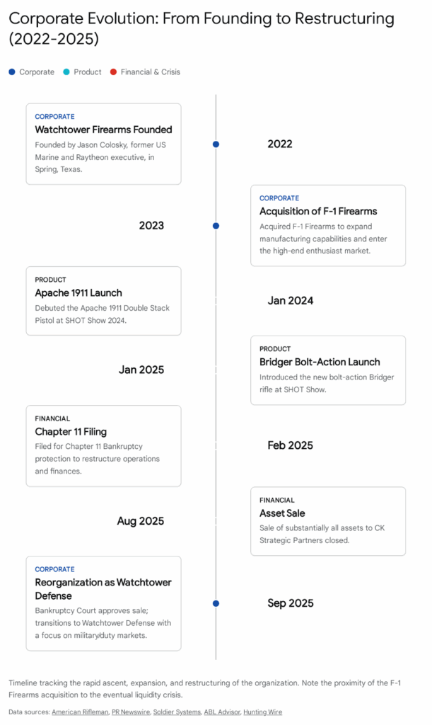 | 2023 | F-1 Acquisition | Watchtower acquires F-1 Firearms (June 12). | Secured immediate manufacturing capacity but inherited legacy “lifestyle” brand baggage. |