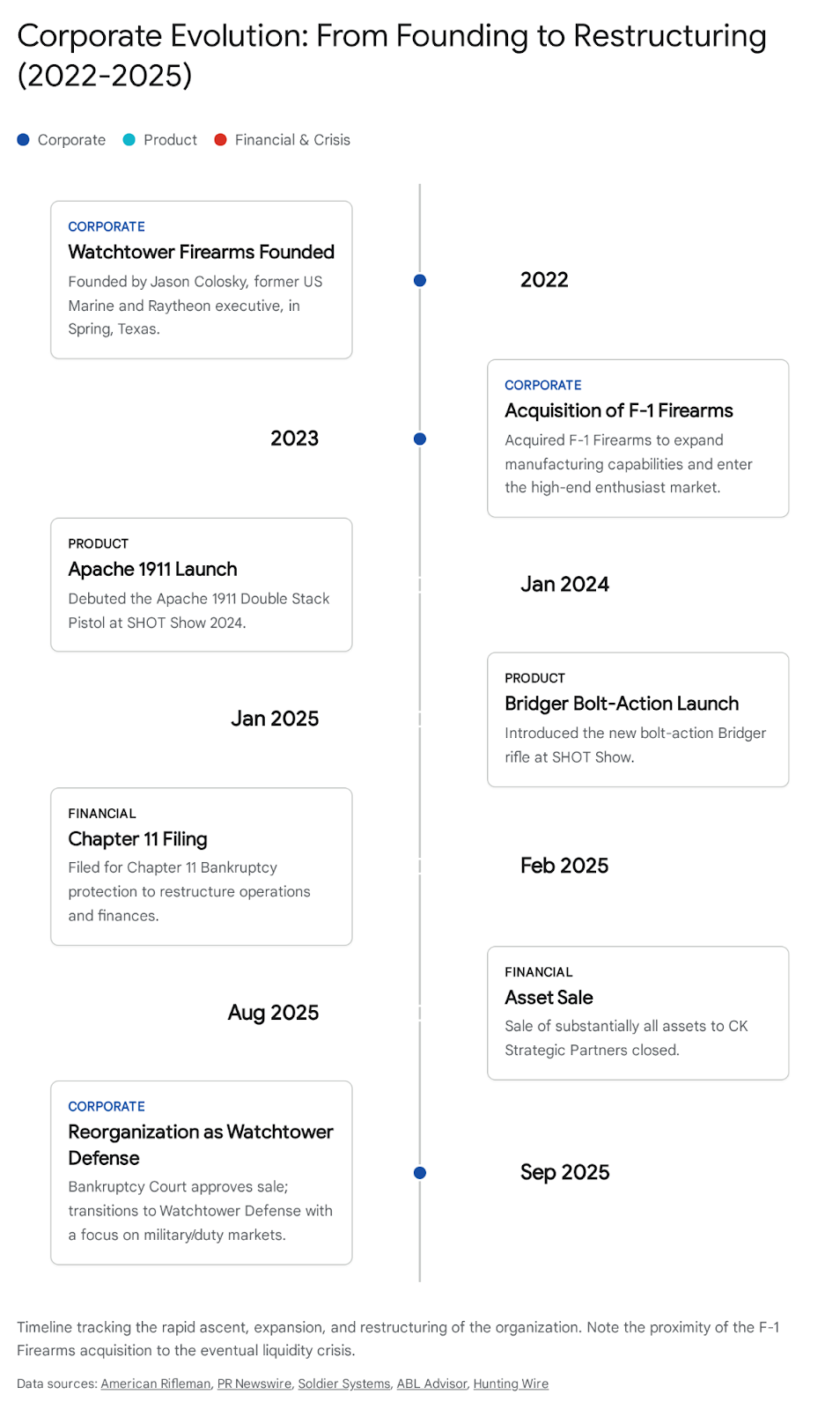 | 2023 | F-1 Acquisition | Watchtower acquires F-1 Firearms (June 12). | Secured immediate manufacturing capacity but inherited legacy “lifestyle” brand baggage. |