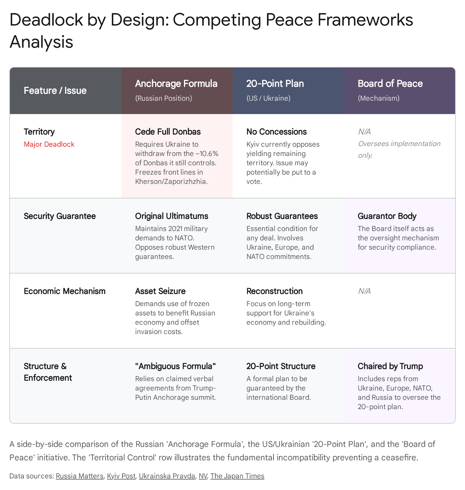 The “20-Point Peace Plan” (US/Ukraine) In contrast, the “20-point plan,” an evolution of a previous 28-point draft, represents the framework supported by Ukraine and the US administration.12