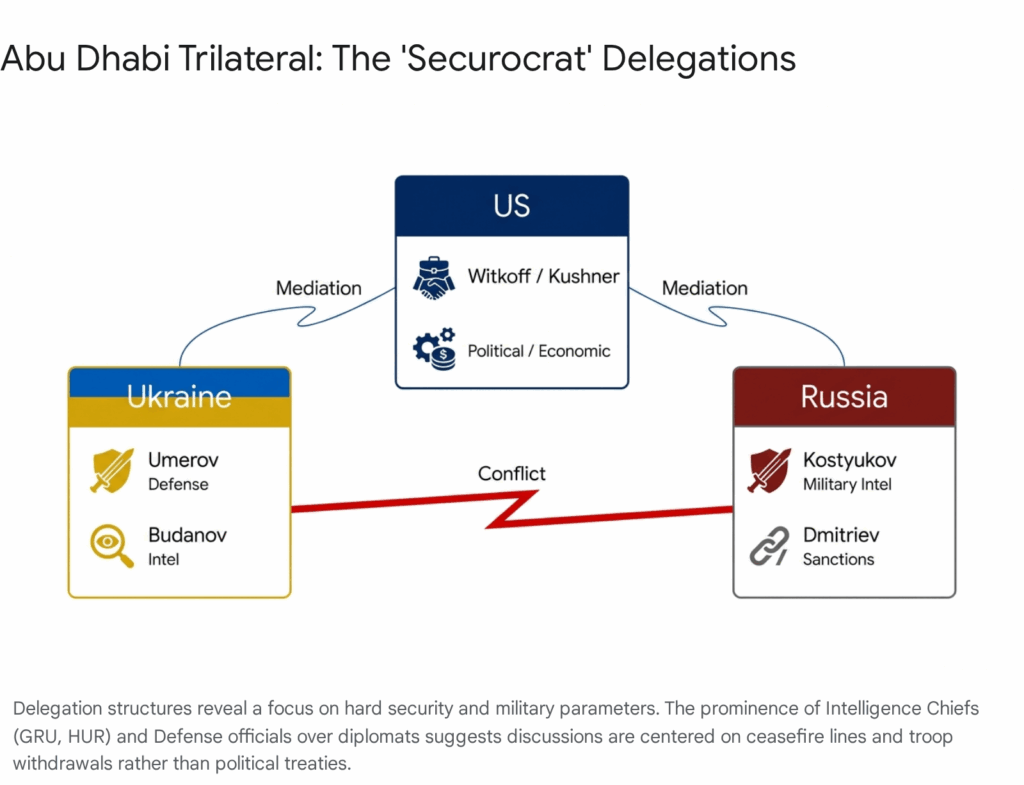 - Russian Delegation: Moscow dispatched a highly militarized delegation led by Admiral Igor Kostyukov, head of the Main Directorate of the General Staff (GRU).2 The decision to send the GRU chief—responsible for military intelligence and special operations—rather than a diplomat like Sergey Lavrov represents a clear signal: Russia views these talks through a strictly military-strategic lens. The presence of Kirill Dmitriev, CEO of the Russian Direct Investment Fund (RDIF), indicates that sanctions relief and the unfreezing of assets are Russia’s primary non-military objectives.9