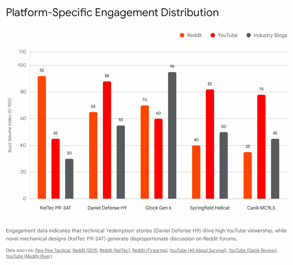 As illustrated in the chart above, technical “redemption” stories like the Daniel Defense H9 drive high YouTube viewership because users are seeking long-form video evidence of reliability. In contrast, novel mechanical designs like the KelTec PR-3AT generate disproportionate discussion on Reddit, where users debate the theoretical utility and mechanics of the stripper-clip system. The Glock Gen 6 maintains high volume across all channels, reflecting its broad, mass-market appeal.
