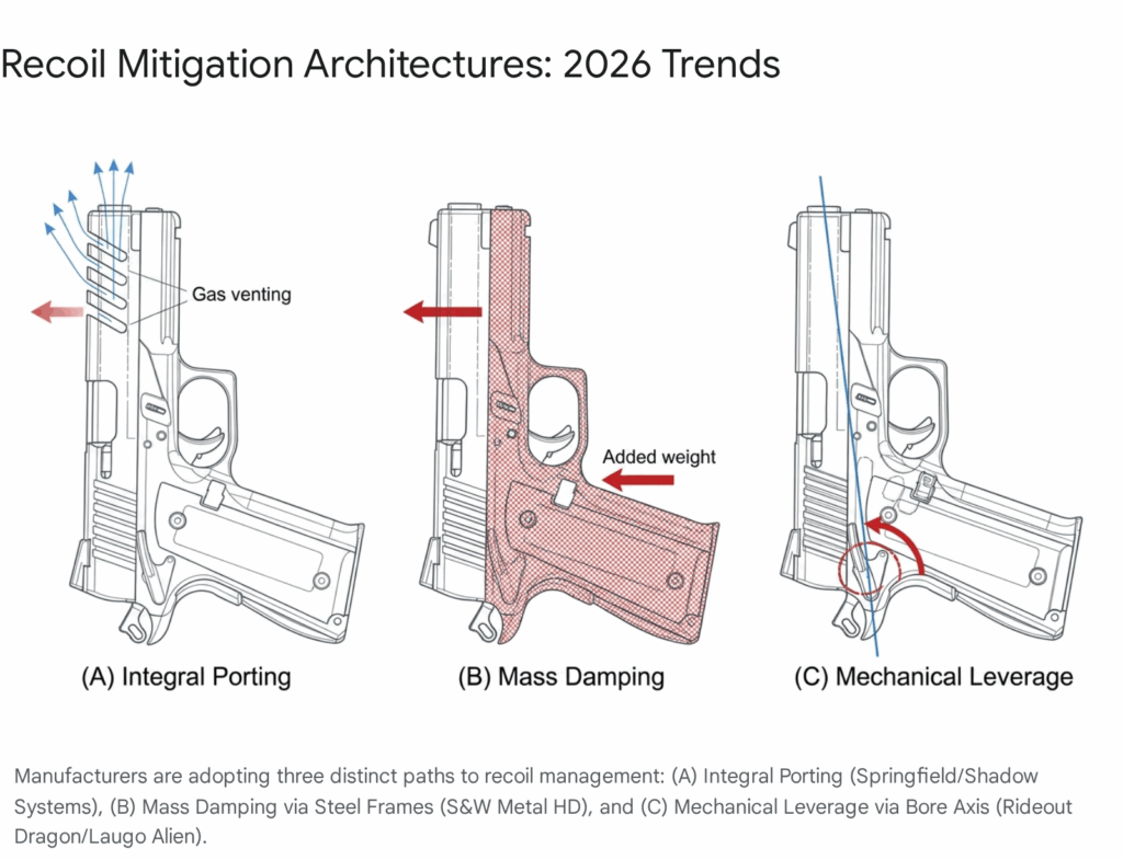 If 2024 was the year of the “Optics Ready” slide, 2026 is definitively the year of the “Integrally Compensated” slide. Manufacturers are moving away from thread-on compensators, which add length and complicate holster compatibility, in favor of machining expansion chambers directly into the barrel and slide geometry. This trend acknowledges a fundamental physics problem: micro-compact 9mm pistols are inherently “snappy” and difficult to control. Integrated compensation democratizes recoil management, making small guns shootable for the average user.