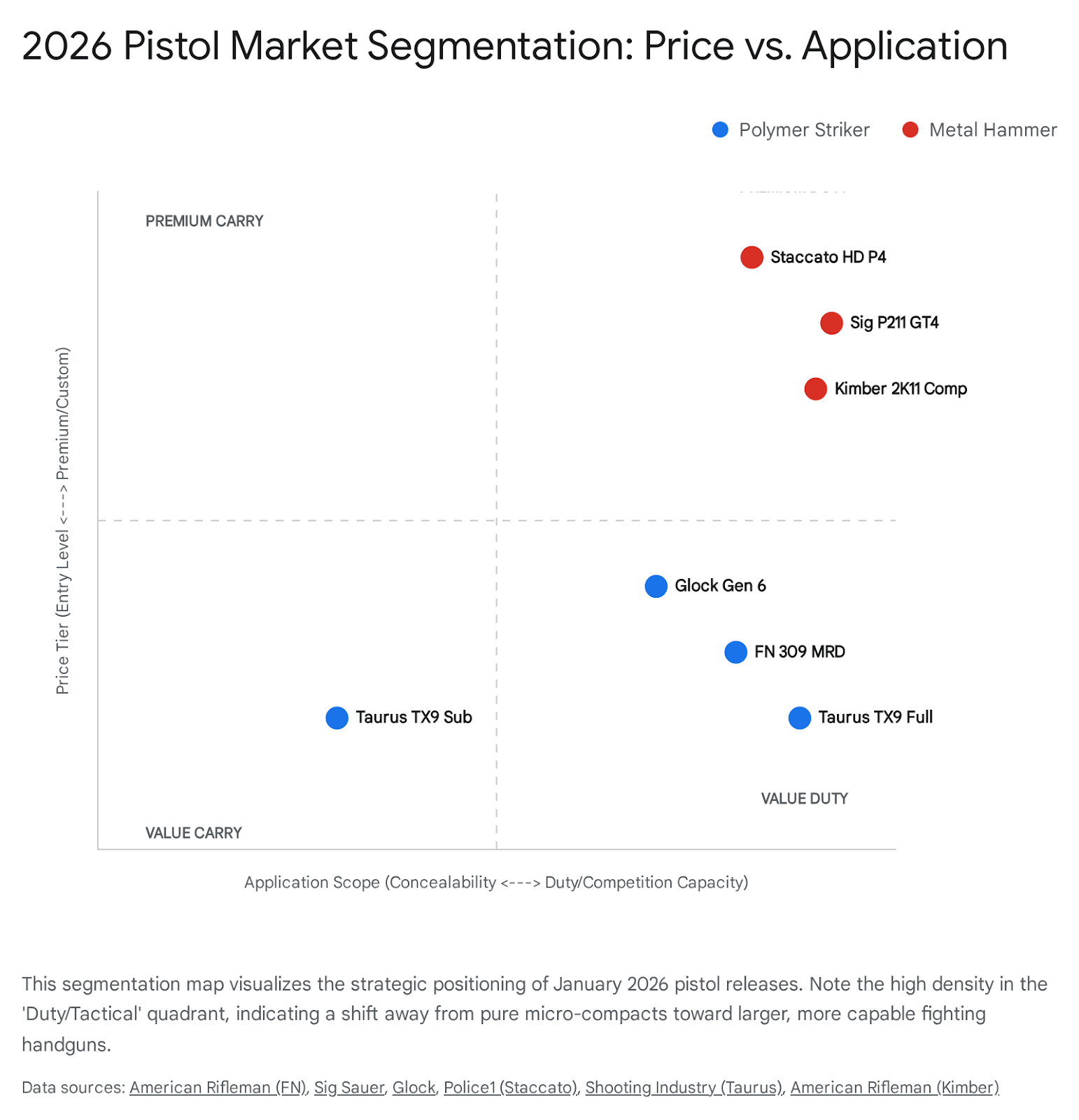 Products were classified based on their primary intended market application (Duty, Concealed Carry, Competition) rather than strictly by dimensions. Trends were identified by clustering similar feature sets (e.g., “Integral Compensation”) across multiple vendors. “Value” assessments were derived by comparing MSRP against feature density (capacity, optic readiness, included accessories). All data points were cross-referenced against at least two independent sources where possible to ensure accuracy.
