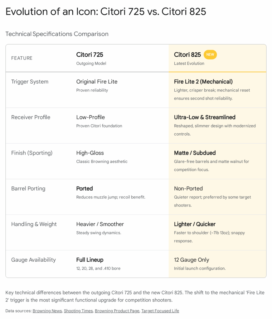 | Browning | Citori 825 | Fire Lite 2 mechanical trigger; lower profile receiver; sleeker ergonomics | Competition / Upland | High |