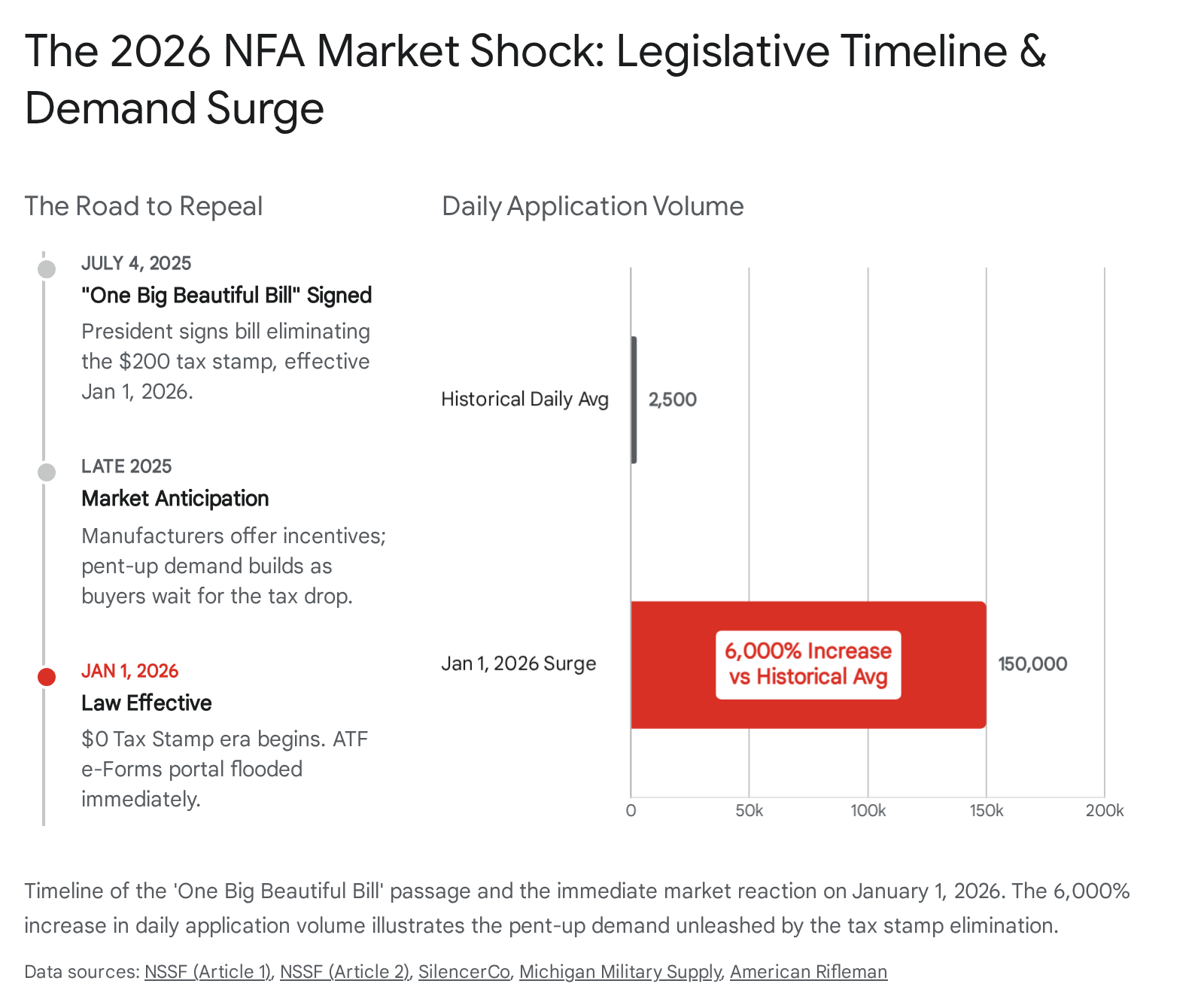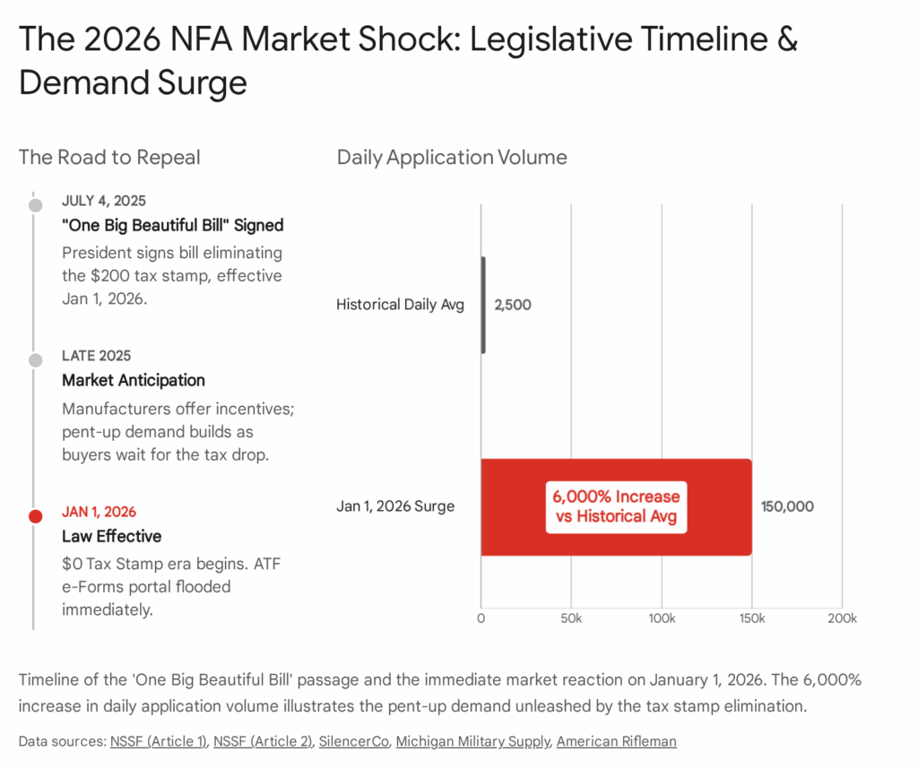 Effective January 1, 2026, the financial barrier to owning these items was officially removed. While the bureaucratic requirements of registration, background checks, and Form 4 submissions remain in place, the removal of the excise tax has fundamentally altered consumer psychology.14 The industry’s reaction has been immediate and overwhelming. On the very first day the tax was lifted, the Bureau of Alcohol, Tobacco, Firearms and Explosives (ATF) received approximately 150,000 eForm submissions—a volume roughly 60 times higher than the daily average of 2,500 observed in previous years.1 This surge confirms a long-held industry hypothesis: the tax, alongside the perceived hassle, was a primary friction point for consumers.