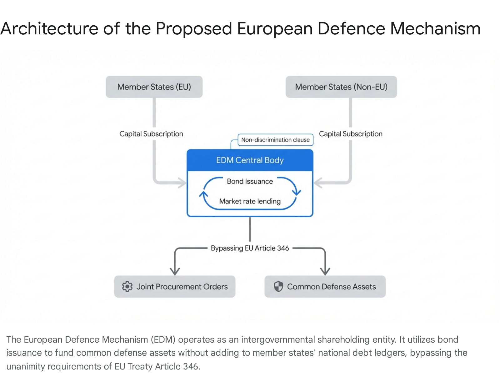 To operationalize this vision, the UK is heavily promoting the European Defence Mechanism (EDM), a concept originally championed by the Bruegel institute and former UK foreign secretary David Miliband.1 The EDM is envisioned as an intergovernmental institution open to all European democracies, deliberately designed to bypass the European Union’s Article 346, which exempts national security from the single market and currently mandates unanimity for any structural change.1