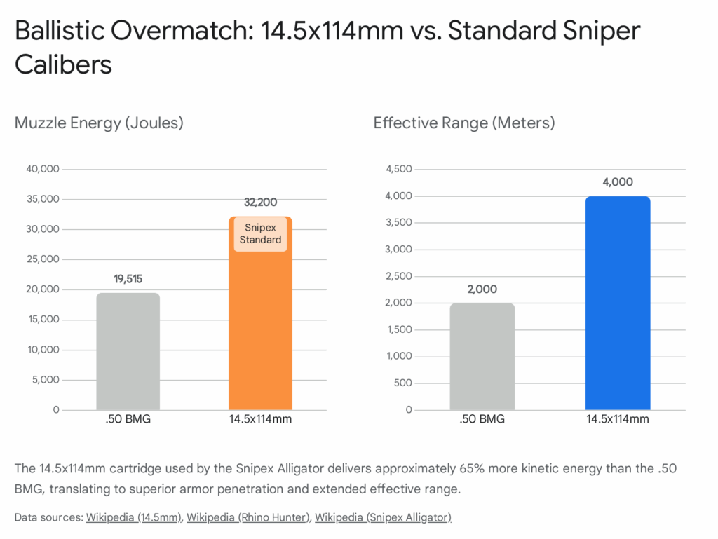 The defining moment in Snipex’s history—and the decision that secured its place in the defense sector—was the move from 12.7mm to 14.5×114mm.