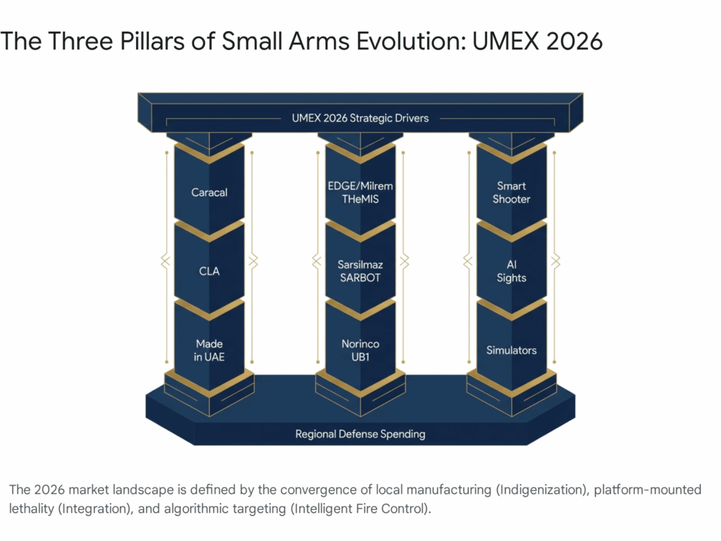 The seventh edition of the Unmanned Systems Exhibition (UMEX) and Simulation and Training Exhibition (SimTEX), convened at the Abu Dhabi National Exhibition Centre (ADNEC) from January 20 to 22, 2026, represents a watershed moment in the trajectory of the global and regional small arms industry. While the event’s nomenclature emphasizes “unmanned systems,” the 2026 iteration revealed a profound and irreversible convergence between traditional infantry weaponry and autonomous architectures. For the small arms industry analyst, the distinction between a “rifle” and a “remote weapon station” (RWS) has effectively dissolved. The exhibition served as the primary theater for the “platforming” of lethality, where kinetic efficacy is no longer defined solely by ballistics, but by integration, digitization, and indigenous control.