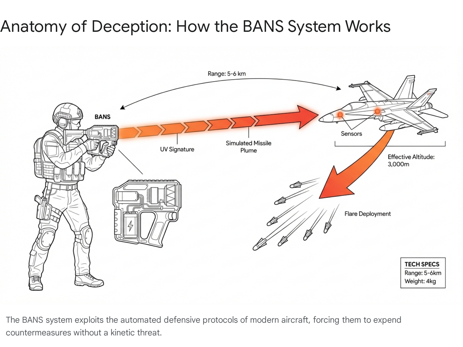 - Tactical Value: It forces enemy pilots to expend their limited defensive countermeasures or abort runs without the operator firing a single expensive missile. It is a psychological and logistical weapon in a rifle form factor.