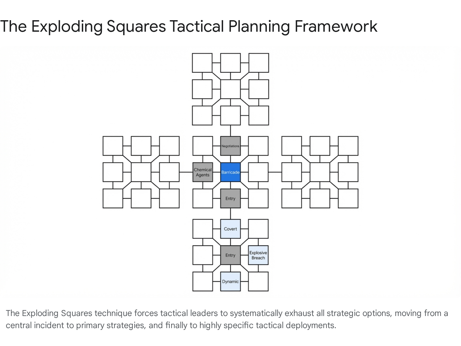 In a barricaded suspect scenario, for example, the instructor places the core problem—the barricade—in the center of a grid. The surrounding squares are populated with primary strategic options, such as Negotiations, Chemical Agents, Entry, and Anxiety Manipulation. The process then “explodes” outward; if “Entry” is selected, it becomes the center of a new grid, prompting sub-tactics like Explosive Breach, Covert Entry, or Limited Penetration. This methodical expansion prevents tactical tunnel vision and ensures teams train for the broadest possible spectrum of options before an incident occurs.