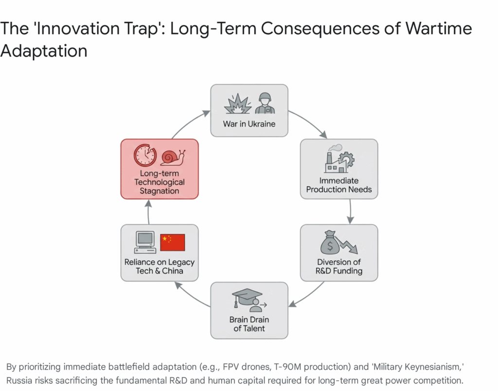 The most profound impact of the war is the creation of an “Innovation Trap.” By focusing all resources on immediate battlefield needs—mass-producing FPV drones, refurbishing T-72s, and casting iron bombs—Russia is starving its R&D sector of the resources needed for long-term breakthroughs.
