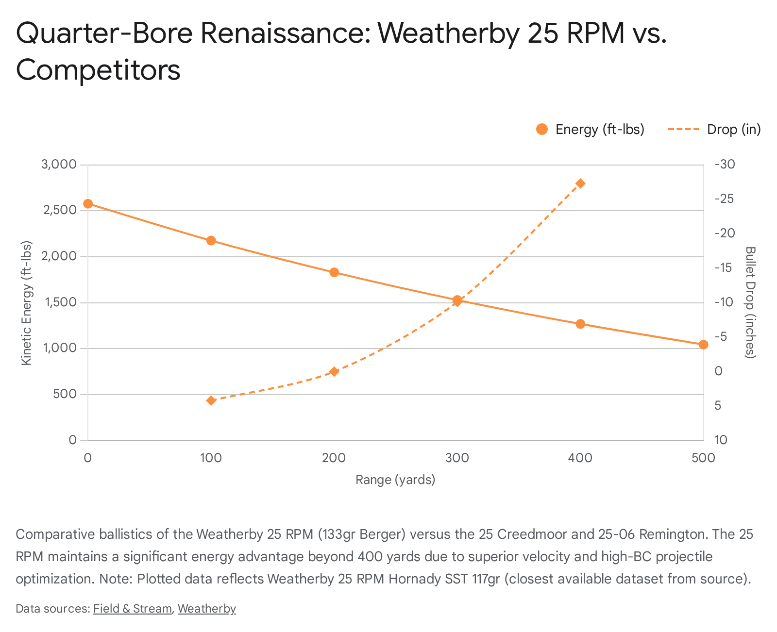 The quarter-bore (.25 caliber) has been dormant for decades, sandwiched between the 6mm and 6.5mm crazes. Weatherby has single-handedly revived this bore diameter with the 25 RPM.