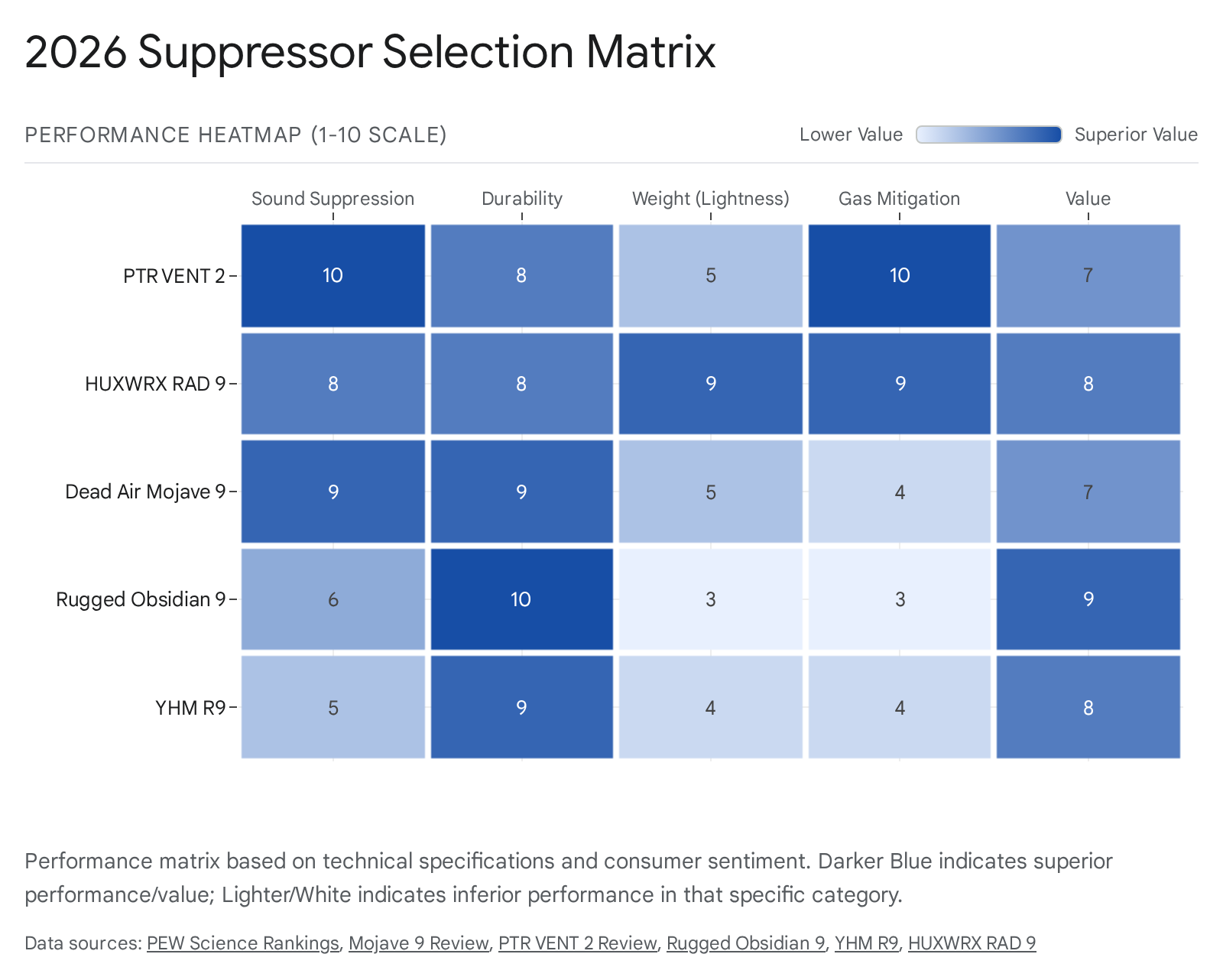 A “Total Market Impact” score was derived by analyzing the volume and tone of discussion across major enthusiast hubs (Reddit r/NFA, SnipersHide, AR15.com, YouTube reviews) and major retailer data (SilencerShop, Capitol Armory). This filter actively removed “shill” reviews (paid promotions) and focused on long-term ownership feedback regarding warranty support, reliability, and “gas face” complaints.