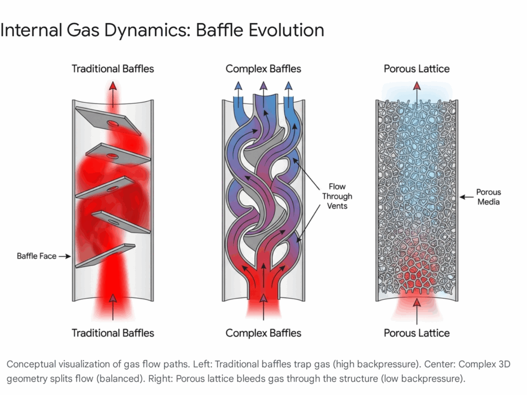 This “metal foam” acts as a massive heat exchanger. As high-velocity gas enters the suppressor, it is forced through this porous media. The chaotic path through the sponge strips thermal energy from the gas at an incredible rate, and since sound is essentially vibrating energy in a medium, this thermal exchange results in rapid noise attenuation.18 Furthermore, because the gas can bleed through the “walls” of the suppressor structure, backpressure is virtually eliminated.