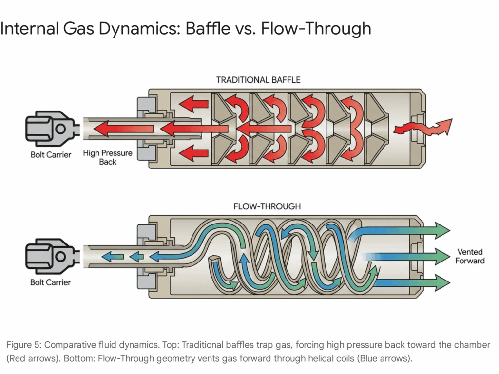- Mechanism: These suppressors typically utilize complex internal geometries—often manufactured via Direct Metal Laser Sintering (DMLS/3D Printing)—to route expanding gases through helical channels or vents that direct the flow forward and out the front of the suppressor, rather than trapping them.26