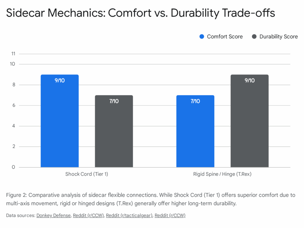 • The Flex System (Shock Cord): Early sidecar designs (like the original T.Rex Arms Sidecar) were rigid, one-piece Kydex. These were prone to cracking in the middle due to the stress of the body moving. T1C innovated with the Axis and Agis lines, which connect the holster and mag carrier via military-grade shock cord.37 This flexible spine allows the rig to bend with the wearer’s body, significantly improving comfort and reducing stress on the Kydex.