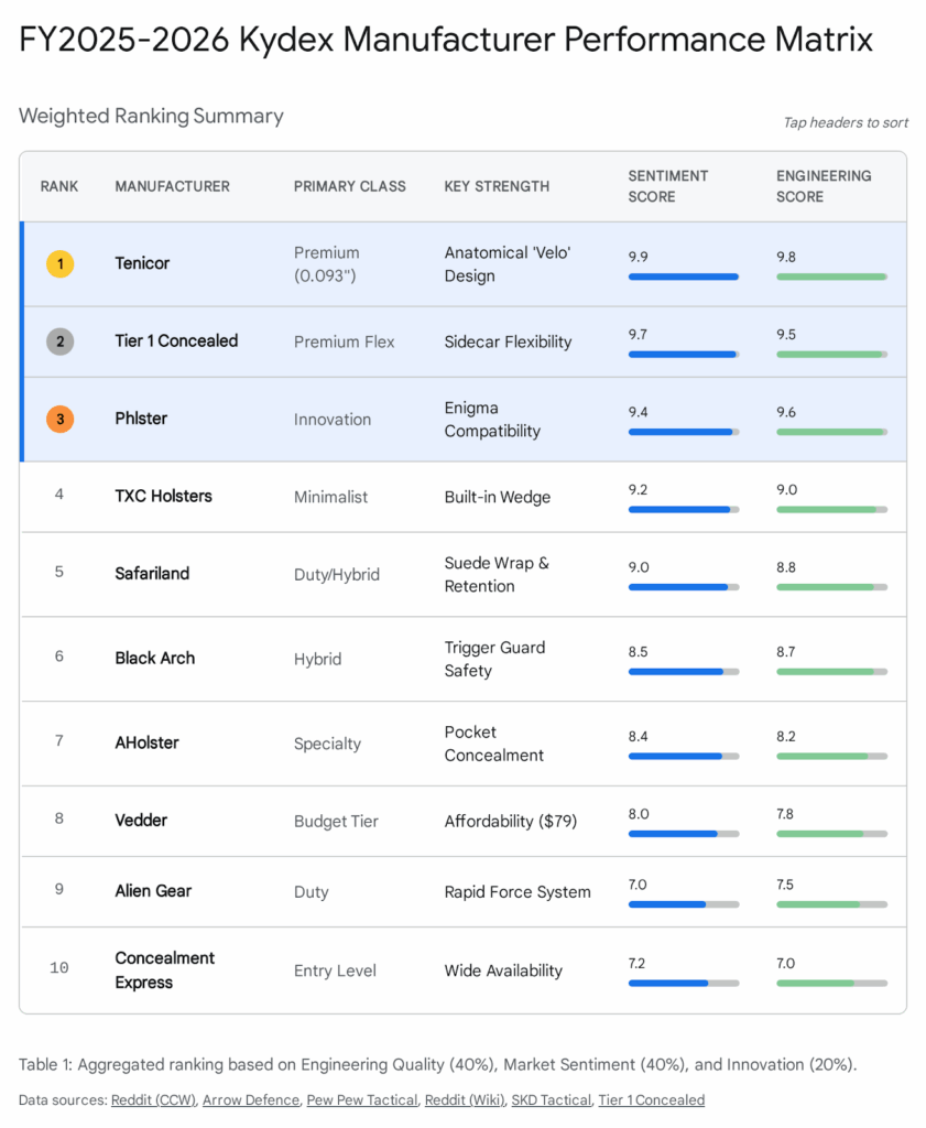 The United States small arms accessory market, specifically the sector dedicated to concealment holsters, has undergone a radical transformation over the past decade. What was once a cottage industry characterized by hobbyist “foam press” operations and leather craftsmanship has evolved into a high-precision manufacturing sector dominated by aerospace-grade thermoplastics, Computer-Aided Design (CAD), and CNC automation. This report provides an exhaustive, engineer-level analysis of the top 10 Kydex holster manufacturers in the United States for the 2025-2026 fiscal period. The rankings and insights presented herein are derived from a rigorous synthesis of thousands of primary consumer sentiment data points—sourced from active enthusiast communities and social media platforms—and a technical evaluation of build quality, material science, and design geometry.