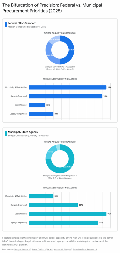 The analysis of contract awards, solicitation notices, and distributor sales data reveals a bifurcated market. Federal agencies with substantial budgets are aligning almost exclusively with military-standard chassis systems (Barrett, LMT), while municipal and state agencies are gravitating toward high-value production rifles (Bergara, Tikka) that offer sub-MOA performance at one-quarter of the cost of their federal counterparts.