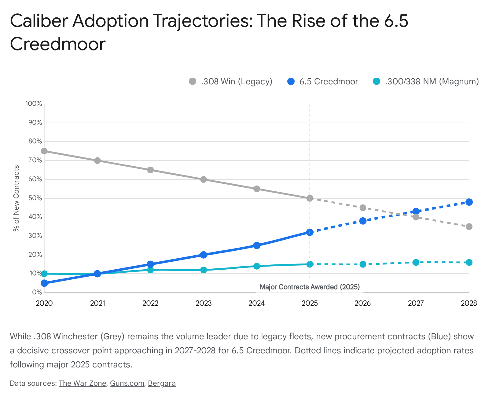 The future trajectory points toward a 50/50 split between bolt-action and semi-automatic platforms, with 6.5 Creedmoor likely surpassing.308 Winchester in new contract starts by 2027.