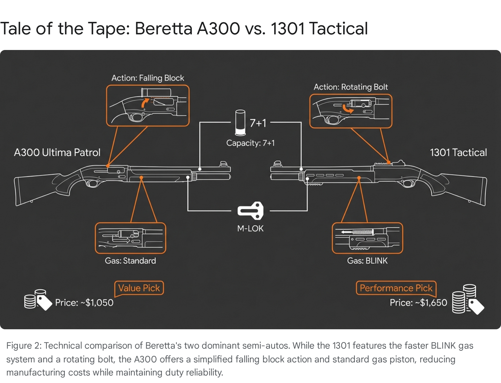 | 3 | Beretta A300 Ultima Patrol | Semi | 12 GA | 94% / 6% | $950 / $1,150 / $1,050 | Patrol Semi-Auto Transition |