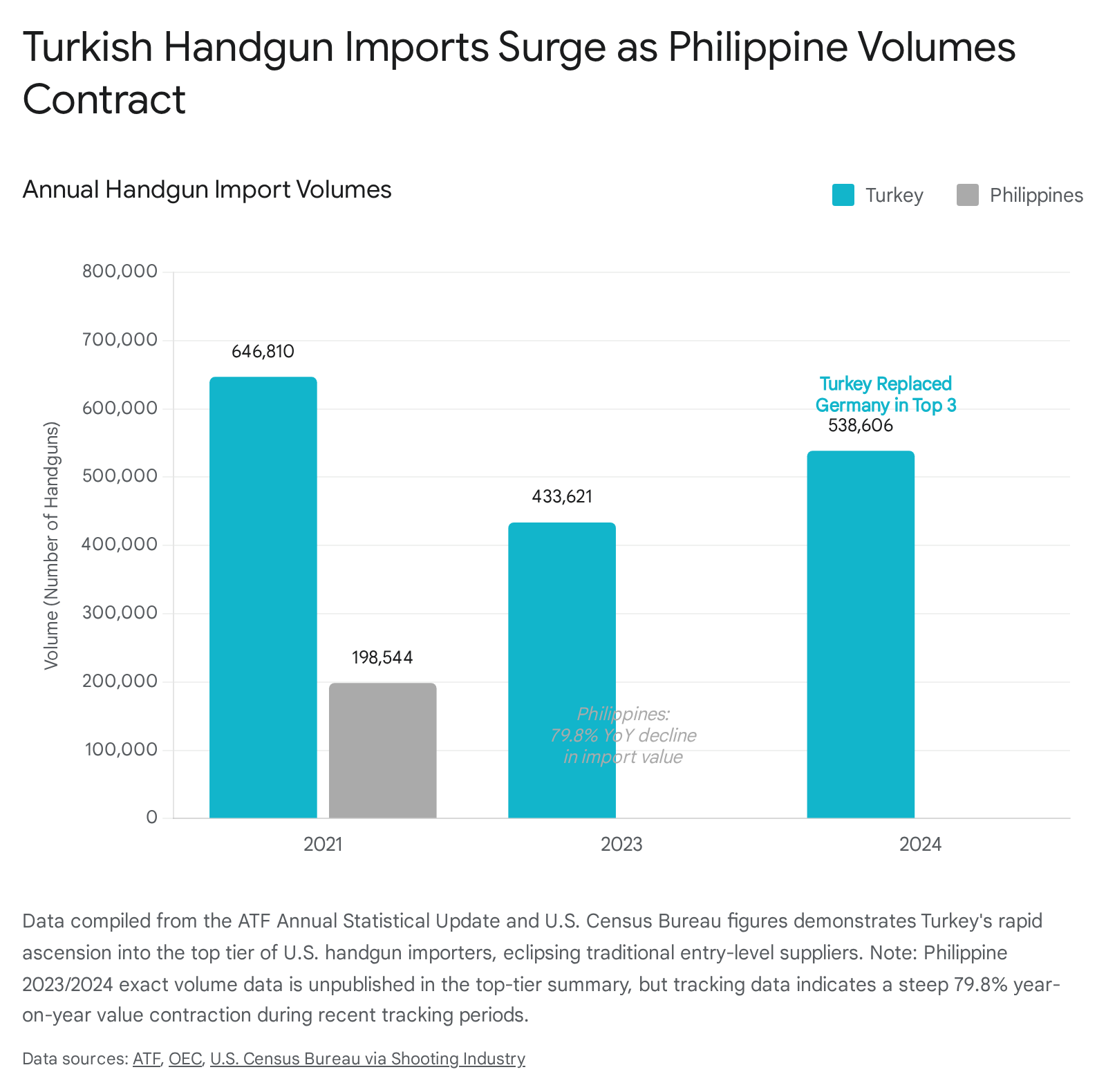 The observation that Turkish suppliers are supplanting the Philippines as the preferred source for entry-level 1911 and 2011 firearms is empirically, technically, and strategically accurate. The evidence is overwhelming across macro-economic import data, metallurgical feature sets, online consumer sentiment, and corporate supply chain investments.