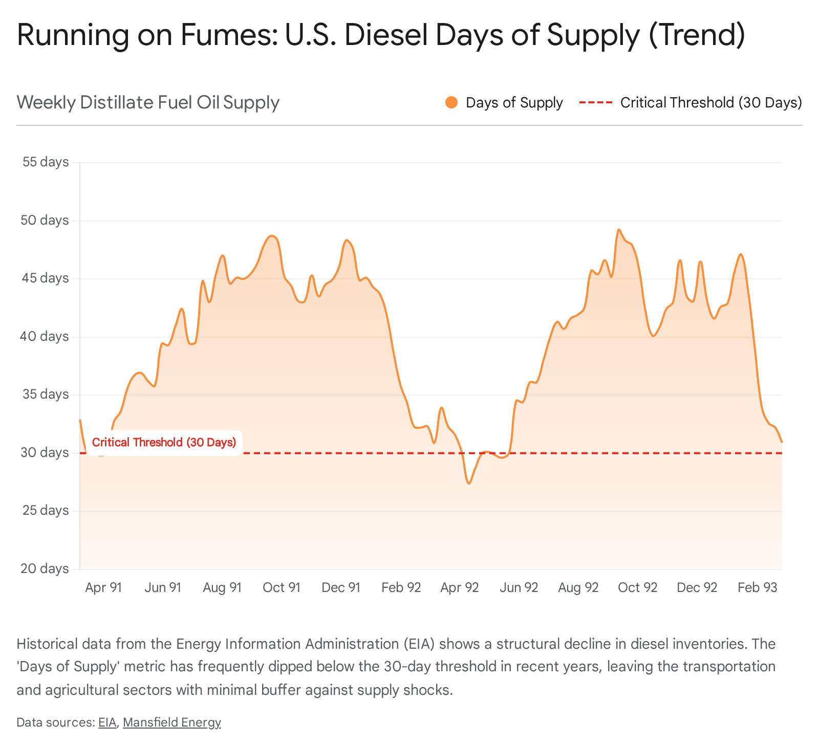 - Inventory Concerns Take Center Stage as Diesel Days of Supply Drop Below 30, accessed January 13, 2026, https://mansfield.energy/2025/07/22/inventory-concerns-take-center-stage-as-diesel-days-of-supply-drop-below-30/