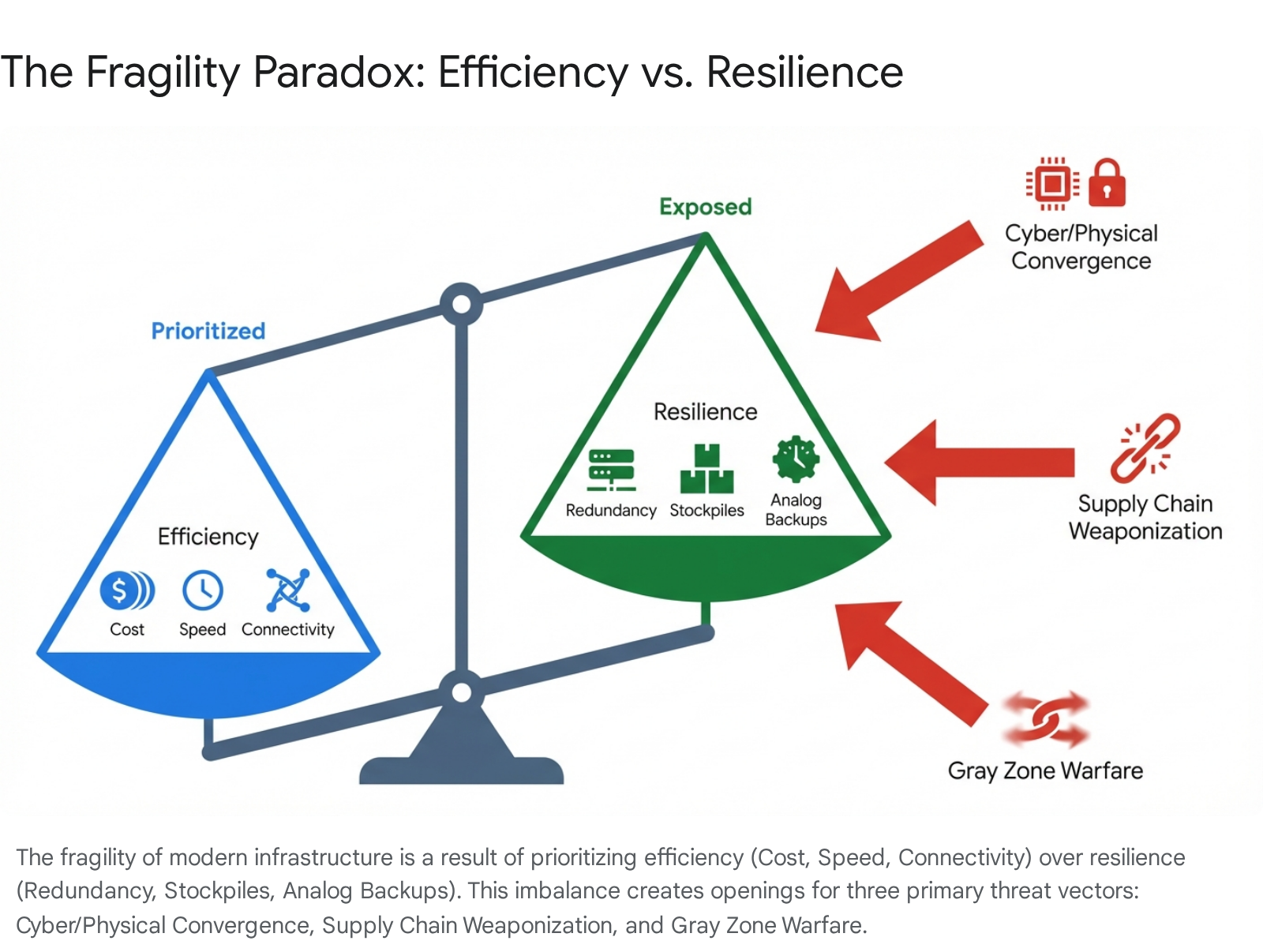 The fragility we face is structural. It stems from a decades-long strategic decision to prioritize efficiency—defined by Just-in-Time delivery, the lowest bidder procurement, and remote automated management—over resilience—defined by inventory buffers, redundancy, and manual override capabilities.