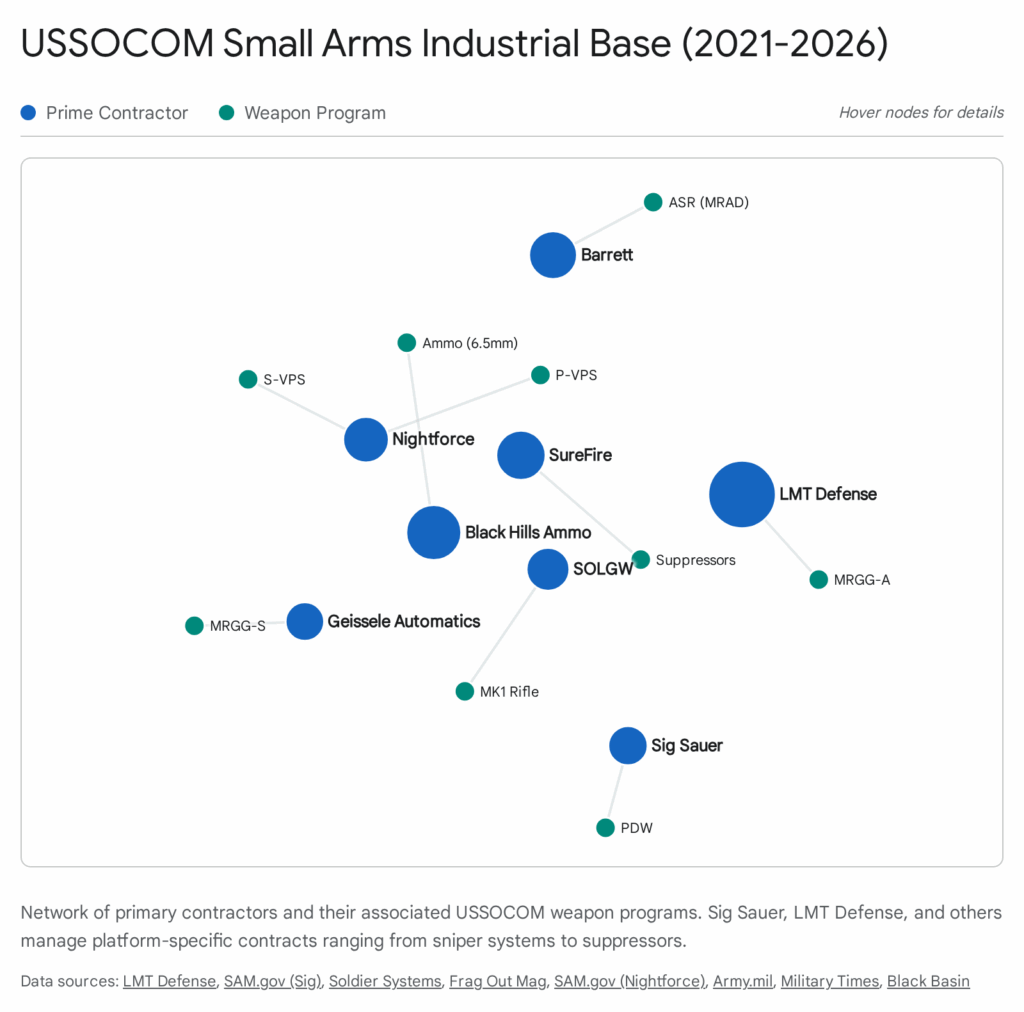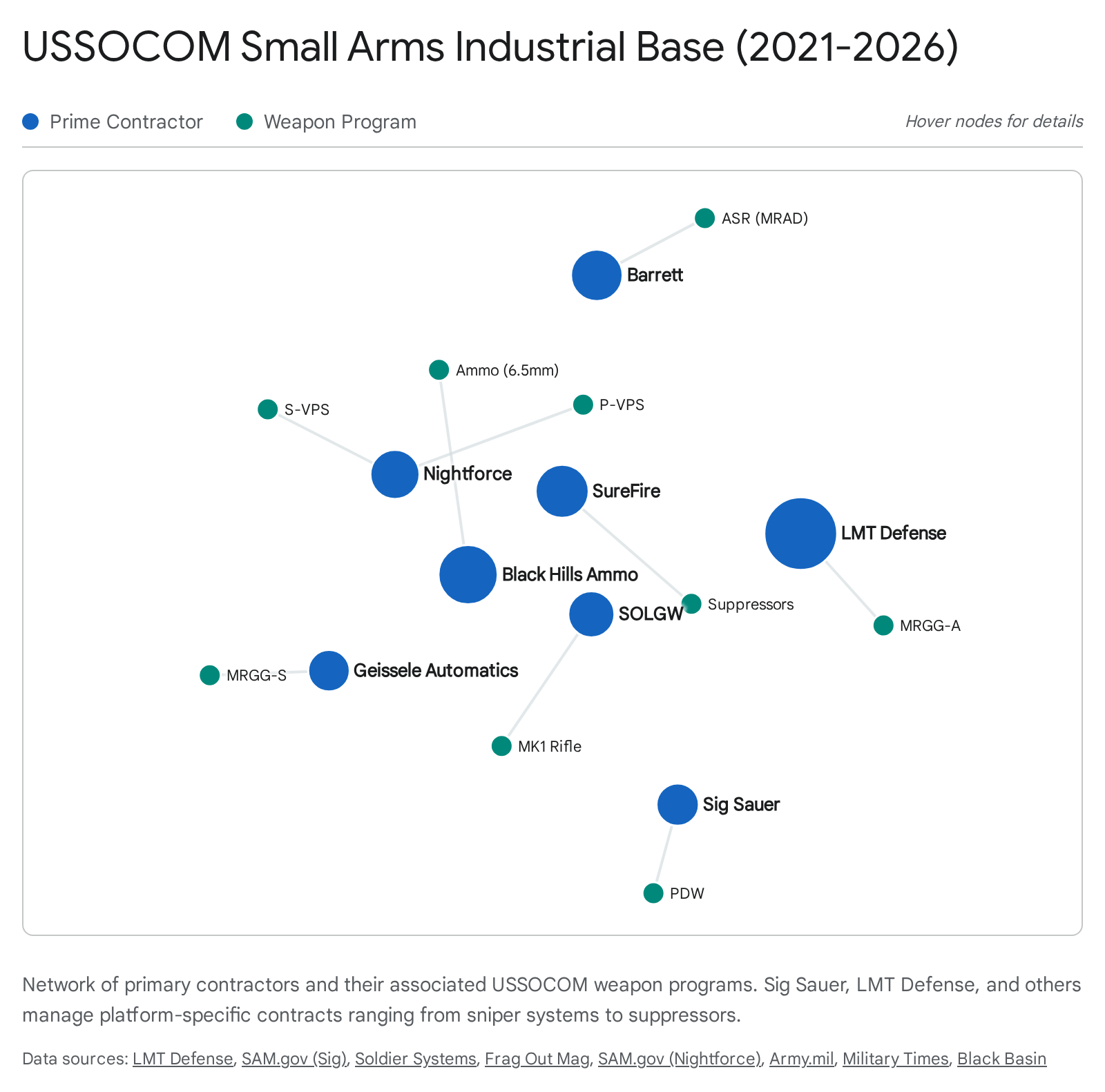 The contracting data from 2021–2026 reveals a distinct hierarchy and specialization within the small arms industrial base serving USSOCOM.